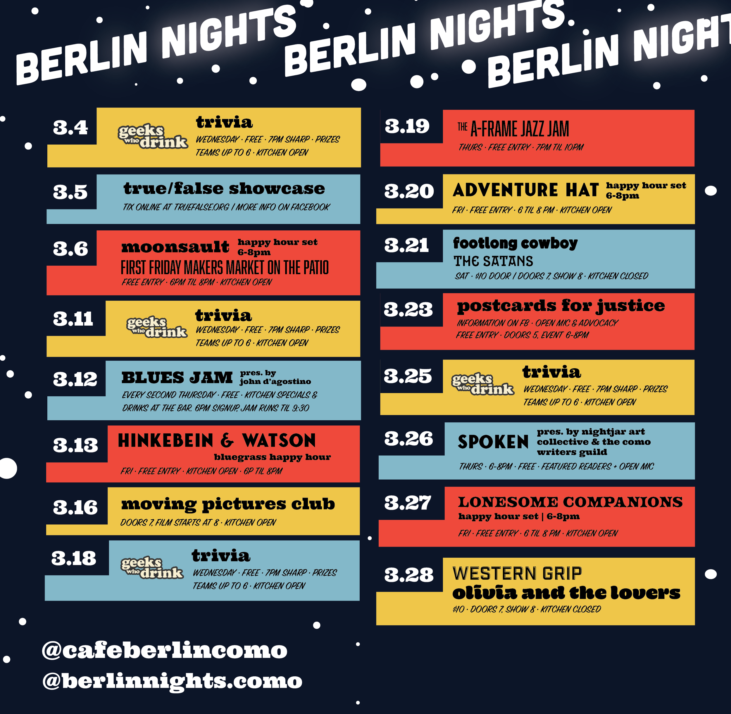 We are a locally owned music venue in downtown Columbia, MO that hosts international and local acts alike. We welcome anyone at our Community Showcases and are happy to be your venue for a private event, too. We’re proud to be an official venue for the True/False Film and Music Festival.