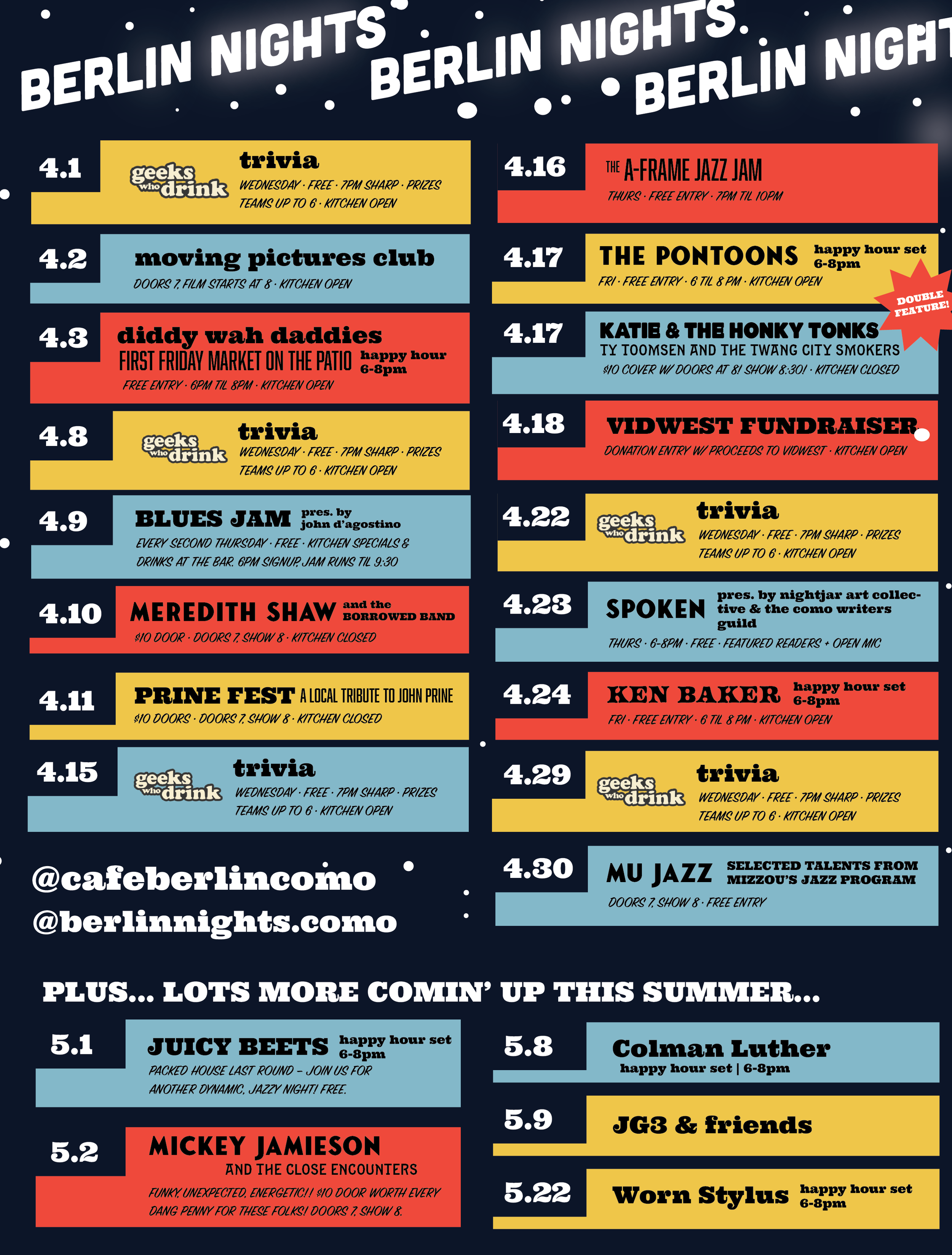Interested in taking the stage? Please send inquiries with links to music, videos, social media and the date/range of dates you need to: